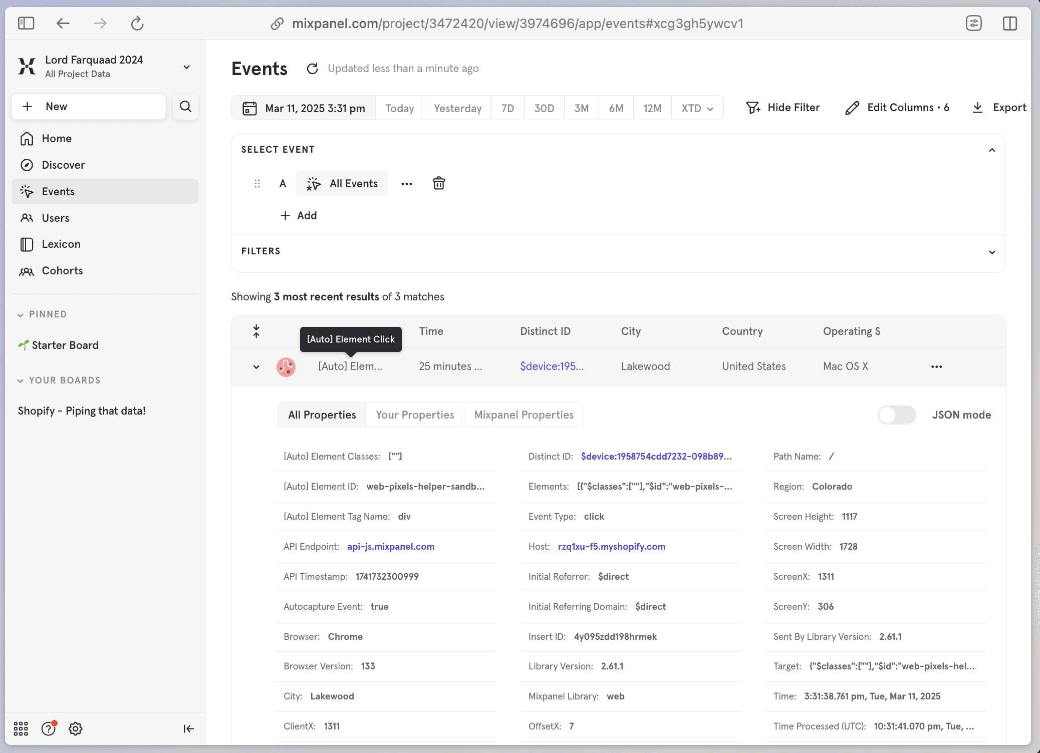 Mixpanel Autocapture gathers pageviews, clicks, scroll events (and more!) automatically. With minimal setup, you can easily unlock fine-grain insights into how customers are engaging with your Shopify storefront. Alternatively, for a powerful cross-platform, no-code solution that syncs your data across surfaces like ad and payment platforms, consider the Vendo/Mixpanel integration available in the Shopify app store.